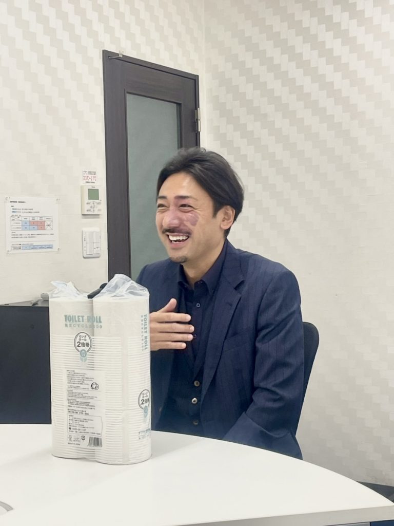 社長!トイレットペーパーでマイク固定するのやめてください。