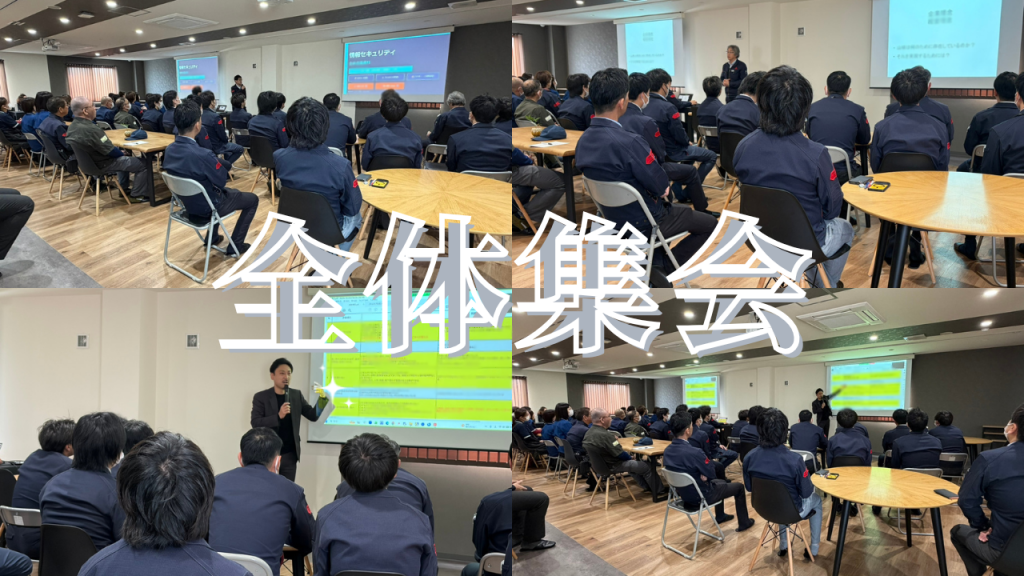 « 前の記事 全体集会を実施しました 2026.04.06 イベントレポート 当社では、2か月に1回、全従業員参加による全体集会を実施しています。 今回も全従業員が参加し、各担当者より以下の内容について共有を行いました。 情報システム係より、セキュリティ対策に関する教育 統括部長より、会社理念および考え方についての説明 代表取締役より、数値報告、世界情勢を踏まえた見通し予想、今後の行動指針についての説明 全体集会は、会社としての方向性や重要な情報を全従業員で共有し、認識をそろえる機会となっています。 今後も継続して実施し、社内の情報共有と意識統一につなげていきます。 一覧へ戻る